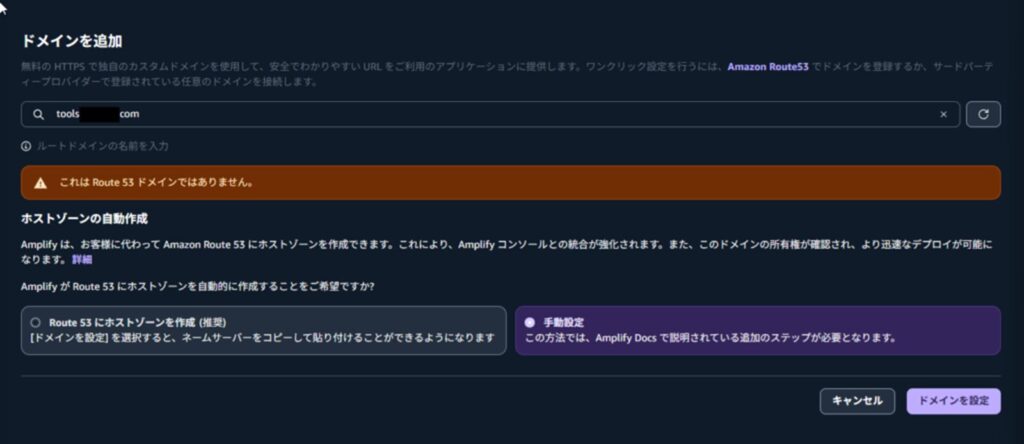 - AmplifyはデフォルトでRoute 53連携を想定しているが、サードパーティDNSでも手動設定で対応できる