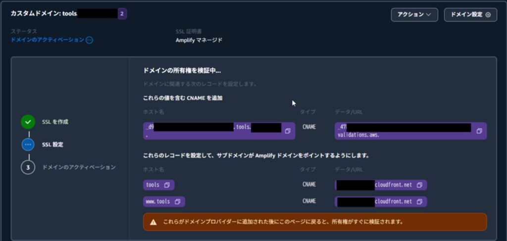 Amplifyコンソールの「これらの値を含むCNAMEを追加」に表示されているレコードを登録します。