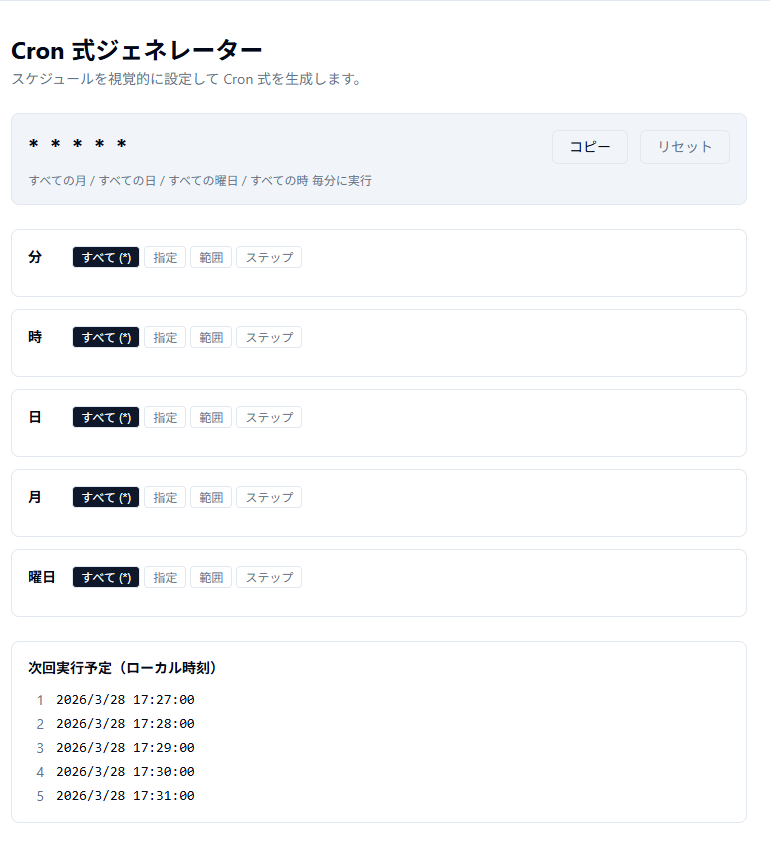 本記事で紹介するツールを使うことで、ボタン操作だけでCron式を生成し、次回実行予定5件をローカル時刻で即座に確認できます。