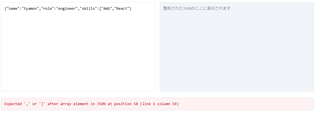 不正なJSONを貼り付けると、エラーメッセージが表示されます。