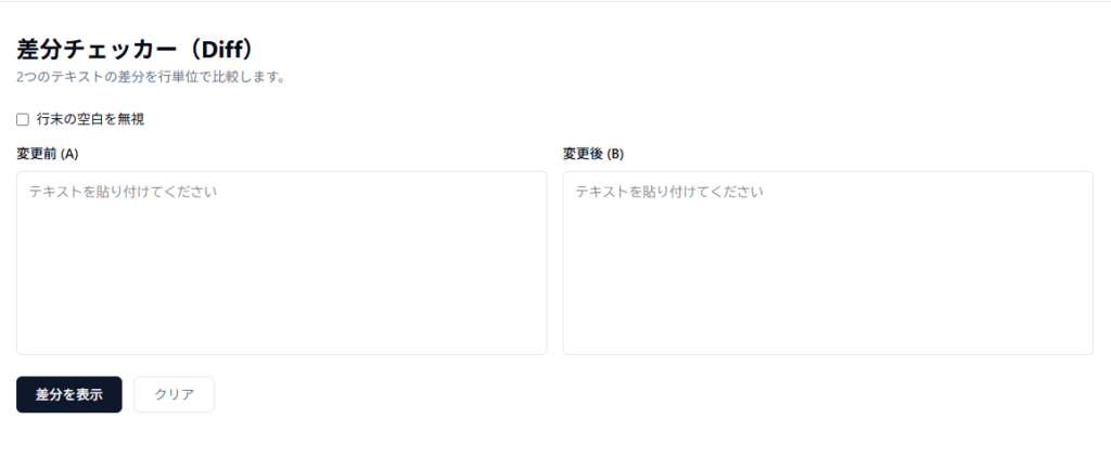 - 変更前・変更後のテキストを貼り付けるだけで行単位の差分を色分け表示